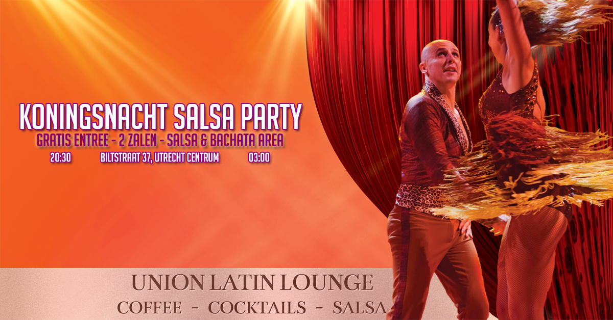 Traditiegetrouw organiseert Union tijdens de bruisende Koningsnacht in Utrecht opnieuw een extra salsafeest. Dit jaar alweer voor de 22ste keer!! Ieder jaar weer grootser dan het vorige. Ook dit jaar pakken we weer flink uit met volledig oranje Latin Lounge en spectaculaire oranje cocktails.